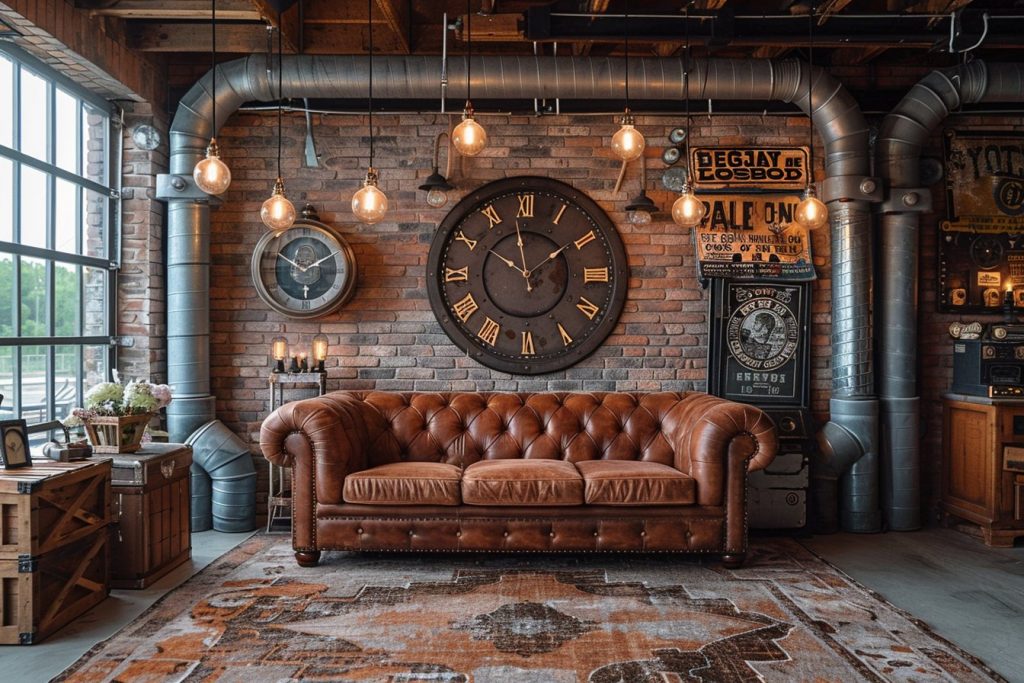 - Les objets décoratifs : misez sur des éléments vintage comme des plaques publicitaires en métal, d’anciens outils détournés, ou encore des tableaux représentant des scènes urbaines ou industrielles.