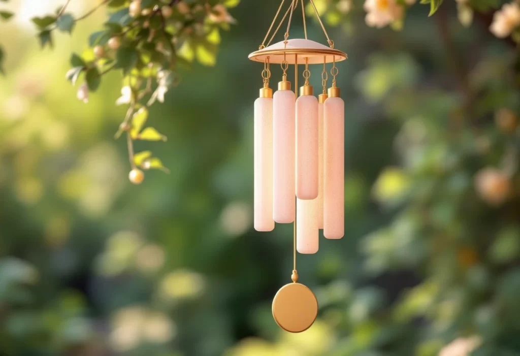 Le carillon lui-même peut mêler métal doré satiné et supports naturels afin de correspondre à l’esprit doux souhaité. Ce mélange apporte une forme raffinée de contraste, renforçant l’impression de sérénité et de naturel sans contraster brutalement.